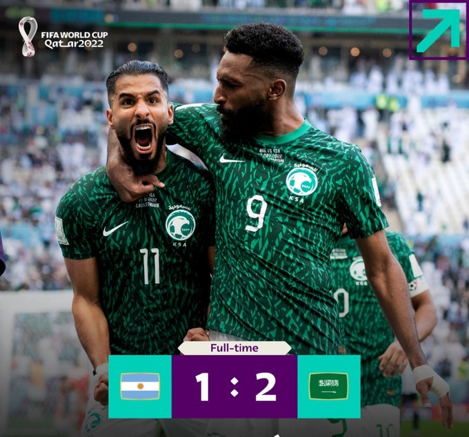 قطر میں جاری فٹبال ورلڈکپ 2022 میں بڑا اپ سیٹ ہوگیا۔ سعودی عرب نے 2 بارکی عالمی چیمپئین ارجنٹائن کو1-2 سے پچھاڑ دیا۔ لوسیل اسٹیڈیم میں عالمی نمبر3 ارجنٹائن اور51 ویں نمبر کی ٹیم سعودی عرب کا جوڑ پڑا۔ کپتان لائنل میسی نے دسویں منٹ میں گول کرکے ارجنٹائن کوبرتری دلائی۔ ریفری نے آف سائیڈ پرارجنٹائن کے3 گول مستردکئے۔ دوسرے ہاف میں سعودی عرب نے دھماکے دارآغازکیا۔ الشہری نے 38ویں منٹ میں گیند کو جال میں پہنچایا۔ 5 منٹ بعد الدوساری نے گول داغ کرمقابلہ 1-2 کردیا۔ ارجنٹائن نے برتری ختم کرنے کیلئےتابڑتوڑحملے کئے لیکن سعودی گول کیپر محمد ال اویس نے ہر حملہ ناکام بنادیا۔ سعودی عرب نے 1-2 سے میدان مارلیا۔ ارجنٹائن کی سعودی عرب کے ہاتھوں شکست فٹبال ورلڈ کپ کی تاریخ کے بڑے اپ سیٹس میں سے ایک ہے۔